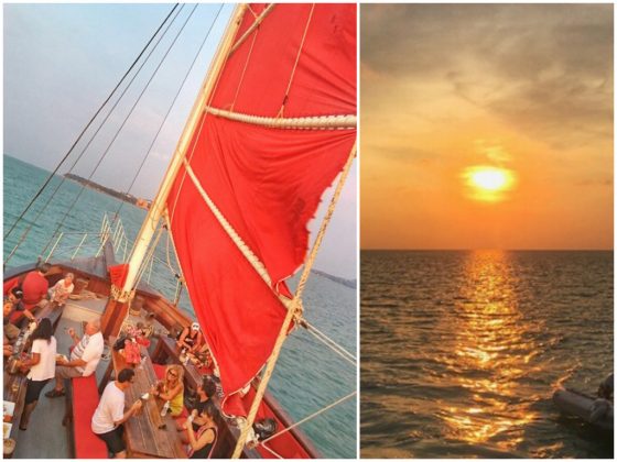 ヤシの木越しに見る夕日は本当にきれいです。マンゴジュース、繊維質豊富なパパヤジュース、ドラゴンフルーツジュースなど、南国ならではのトロピカルフルーツを楽しめます。果物を買って旅行中の便秘解消にも効果的ですよ。
